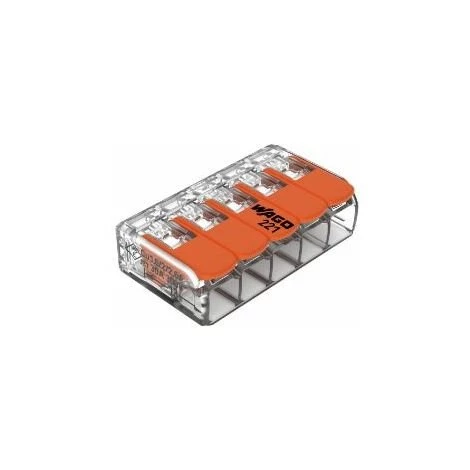 La Mini Borne Wago 221 à 5 entrées est une borne de connexion qui permet un raccordement rapide et simple de 5 conducteurs souples, semi-rigides ou rigides. Elle possède une plage de raccordement de 0,5mm² à 6mm² pour les fils rigides et 0,5mm² à 6 mm² pour les fils souples.