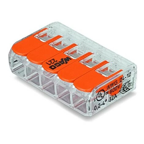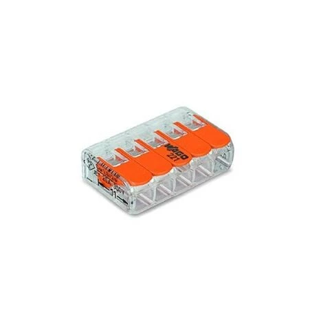 La Mini Borne Wago 221 à 5 entrées est une borne de connexion qui permet un raccordement rapide et simple de 5 conducteurs souples, semi-rigides ou rigides. Elle possède une plage de raccordement de 0,2mm² à 4mm² pour les fils rigides et 0,14mm à 4 mm² pour les fils souples.