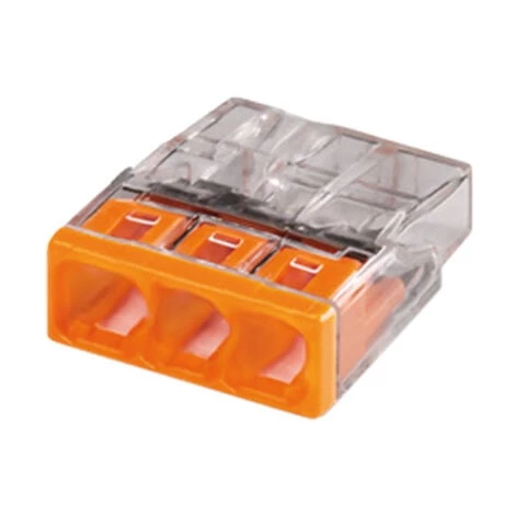 Nombre total des points de serrage : 3 Tension de référence EN [V] : 450V Surtension transitoire de référence [kV] : 4kV Courant nominal [A] : 24A Type de connexion : PUSH WIRE® Raccordement possible : 0.5 à 2.5 mm² Possibilité de contrôler visuellement la connexion grâce au boîtier transparent Doté d’un point de test Longueur de dénudage : 11 mm Largeur : 10 mm Hauteur : 5.8 mm Profondeur : 16.7 mm