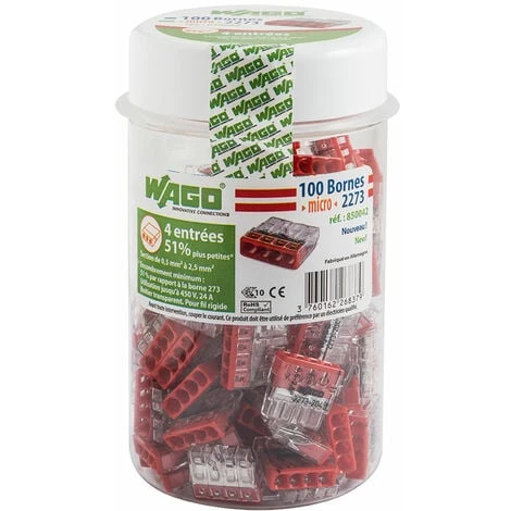 Nombre total des points de serrage : 4 Tension de référence EN [V] : 450V Surtension transitoire de référence [kV] : 4kV Courant nominal [A] : 24A Type de connexion : PUSH WIRE® Raccordement possible : 0.5 à 2.5 mm² Possibilité de contrôler visuellement la connexion grâce au boîtier transparent Doté d’un point de test Longueur de dénudage : 11 mm Largeur : 18 mm Hauteur : 5.8 mm Profondeur : 16.7 mm
