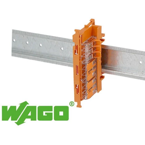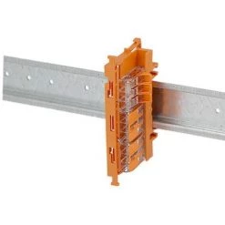 A l’intérieur de cette fixation rail din Wago bornier, il est possible de mettre côte à côte plusieurs borniers de la gamme ultra compact a levier de format différent.