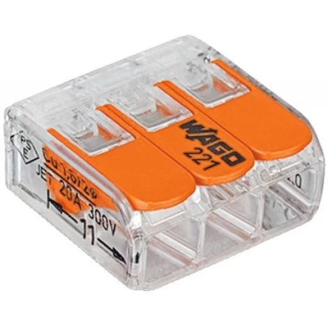 Barrettes et bornes sans visMini borne d’installation universelle pour fils souples et rigides Mini borne avec levier de manipulation pour installation dans boîte de dérivation. Connexion CAGE-CLAMP. Température max. d’utilisation continue: 105 °C. Tension d’utilisation: 450 Fabrication Européenne